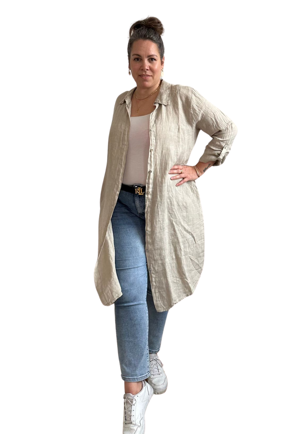 Deze mooie linnen blouse jurk is een must have. Zowel als jurk te dragen of gewoon open op een jeans. Verkrijgbaar in maat s t/m XXL in de kleuren zand en groen.