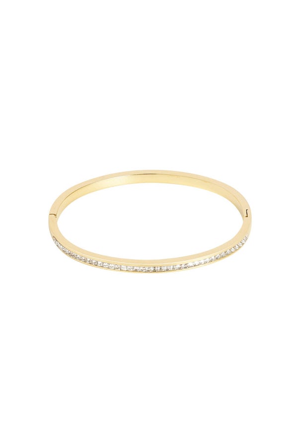 De armband is het perfect te dragen tijdens een chique gelegenheid maar kan ook speels gedragen worden door meerdere armbandjes met elkaar te combineren. De armband is gemaakt van stainless steel en strass steentjes en hebben een diameter van 6 cm.