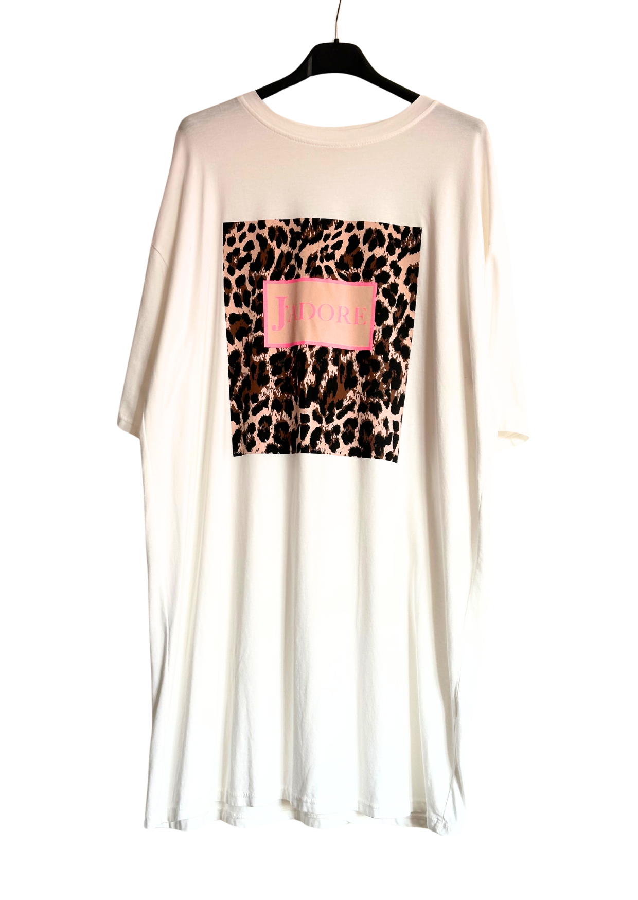Heerlijke t-shirt dress. Leuk met Panter en roze detail. In wit.