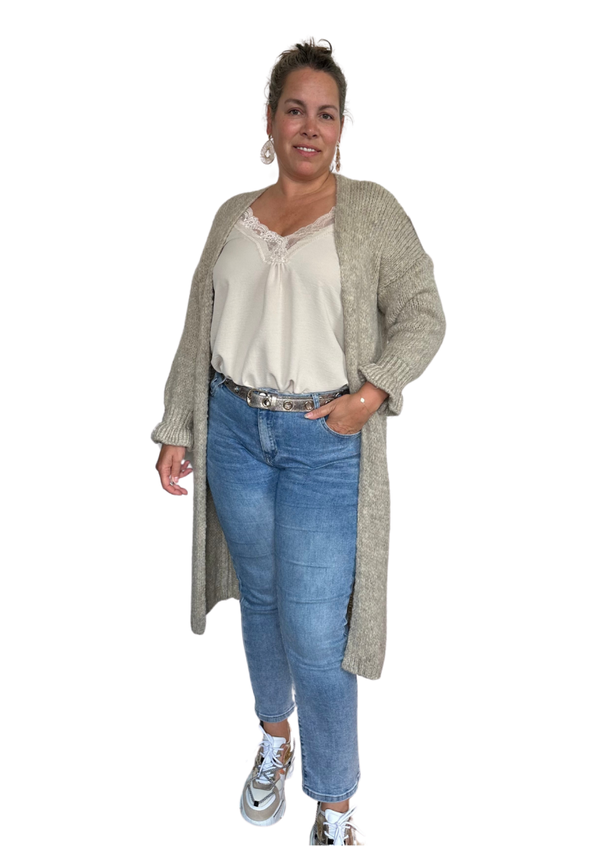 Dit heerlijke lange vest is prachtig en lekker comfortabel. De ruffels aan de mouwen geven het vest een leuk effect. Leuk om nu te dragen met ons kanten hempje eronder en tijdens koud weer lekker met een lange mouwen shirt of een blousje.