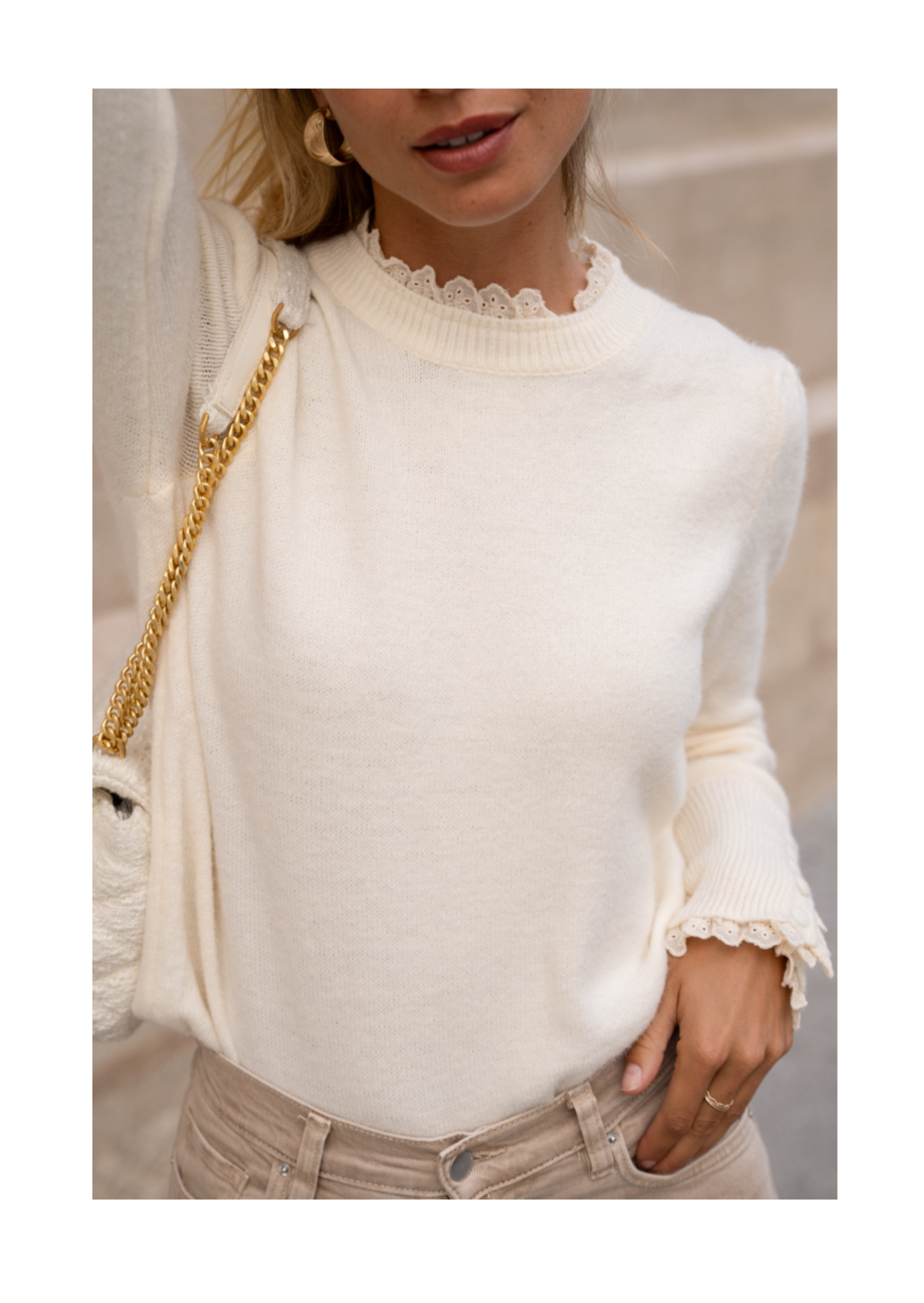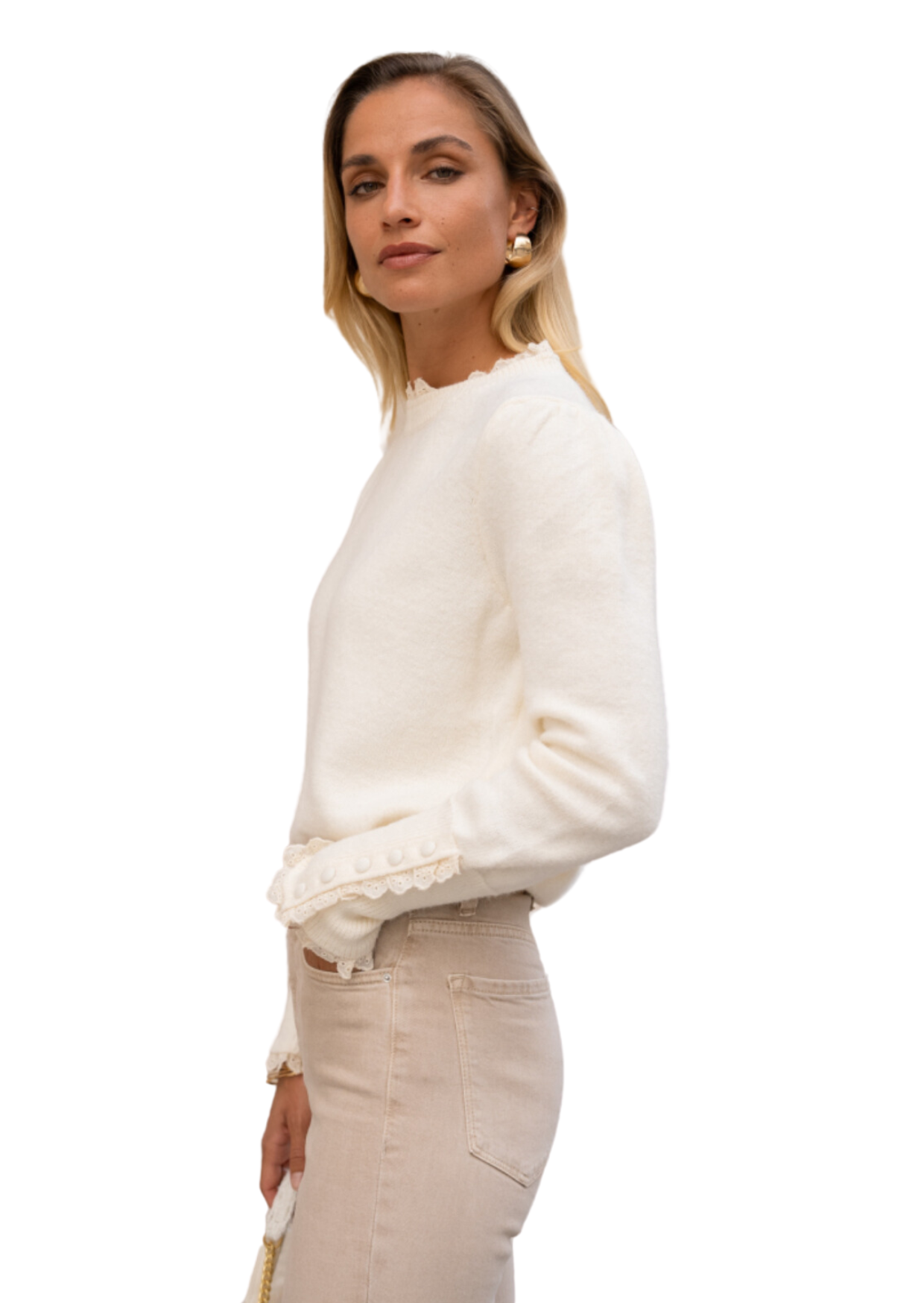 Dit prachtige truitje heeft mooie pofmouwtjes en sierlijke broderie bij de mouwen en hals en prachtige knoop details.