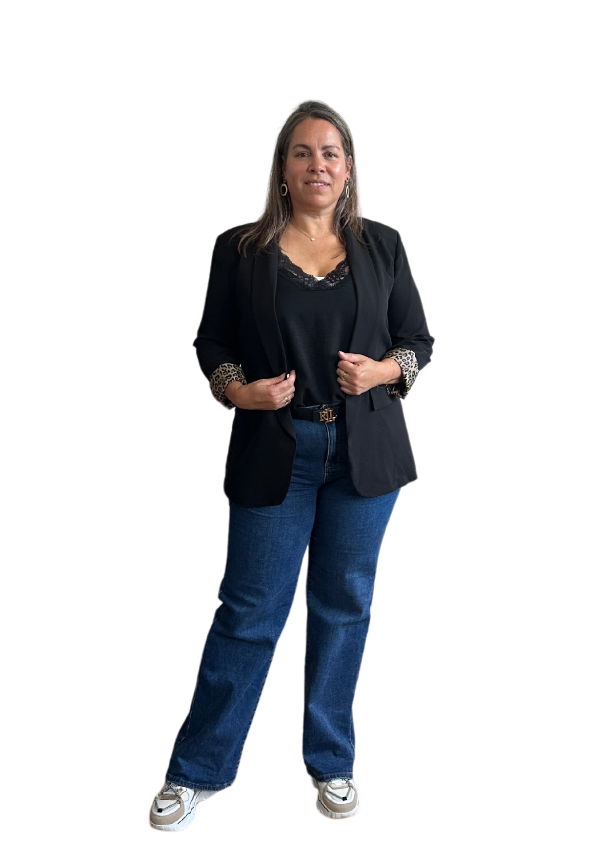 Dit mooie zwarte colbertje heeft een leuk panterprintje bij de manchetten.