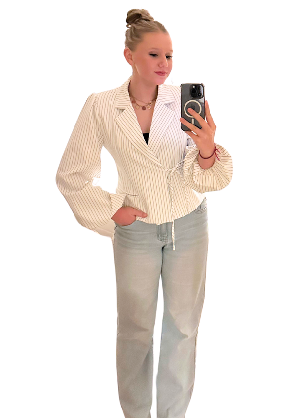 Deze blazer is de musthave van dit moment! Super mooi getailleerd met die leuke speelse mouwen. De blazer is wit met een krijtstreep. Prachtig voor elke gelegenheid. Of het nou school, werk of lekker op een terrasje is, dit jasje past overal.