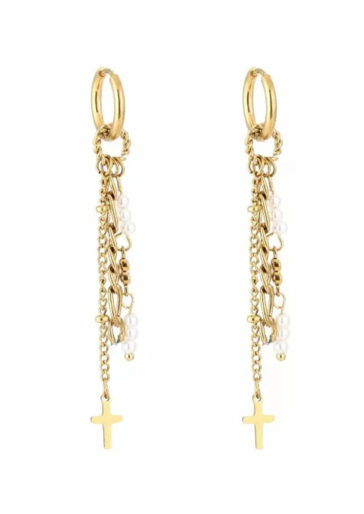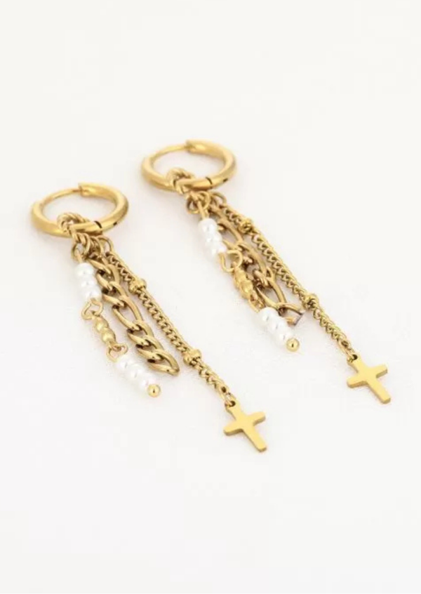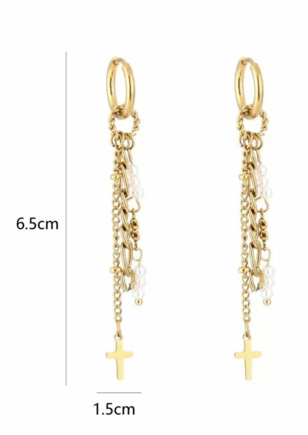 Oorbellen met pareltjes en een kruis hangend aan een kettinkje.