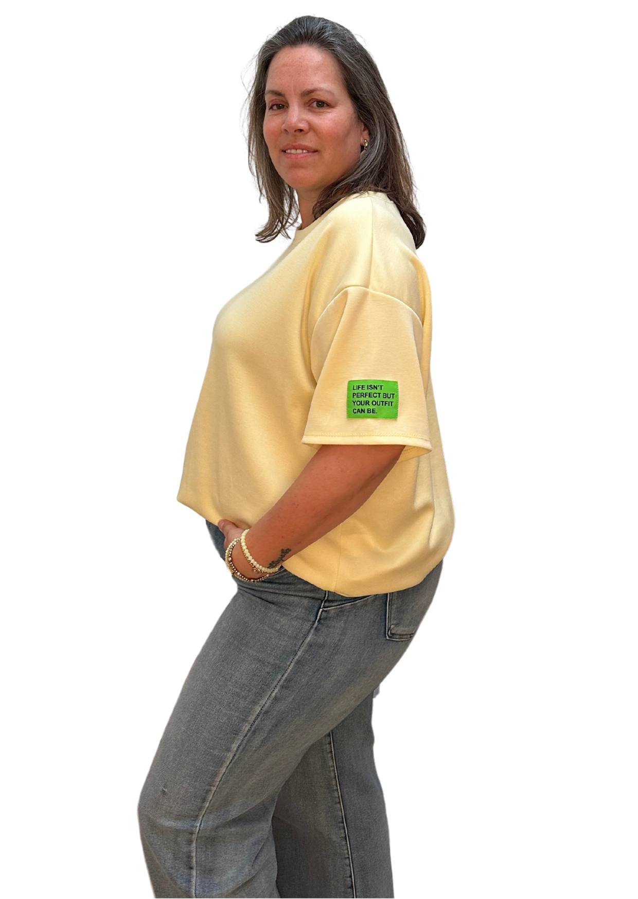 Leuk geel setje van mega zachte stof. Kort broekje valt tot net boven de knie bij mij. Ik ben 1.72. in de mooiie musthave kleur geel