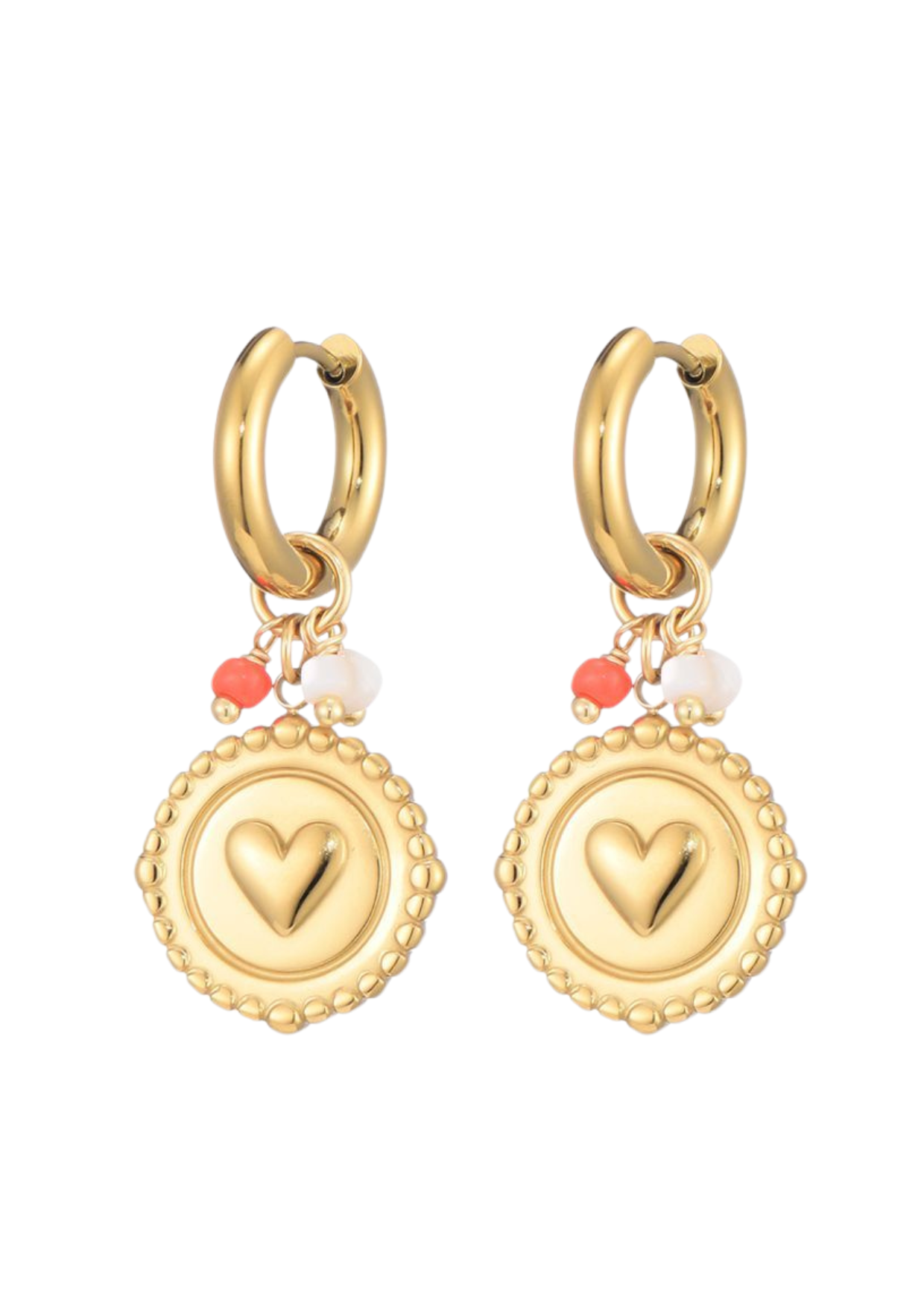 Super leuke oorbellen met kralen bedeltjes en een coin met een hartje erop. Stainless steel