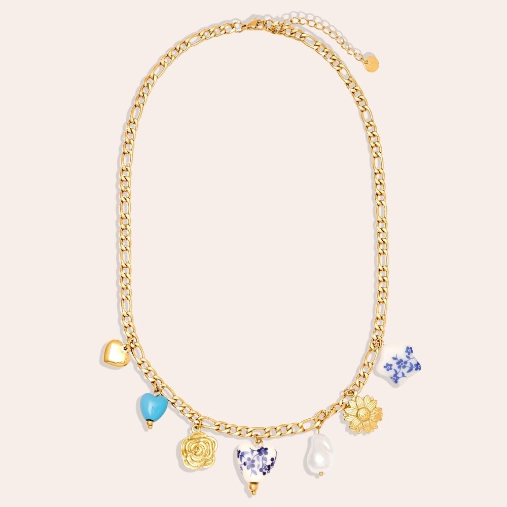 Super mooie bedelketting leuk mooie parels, mooie bloemetjes en wit met blauwe bedels.