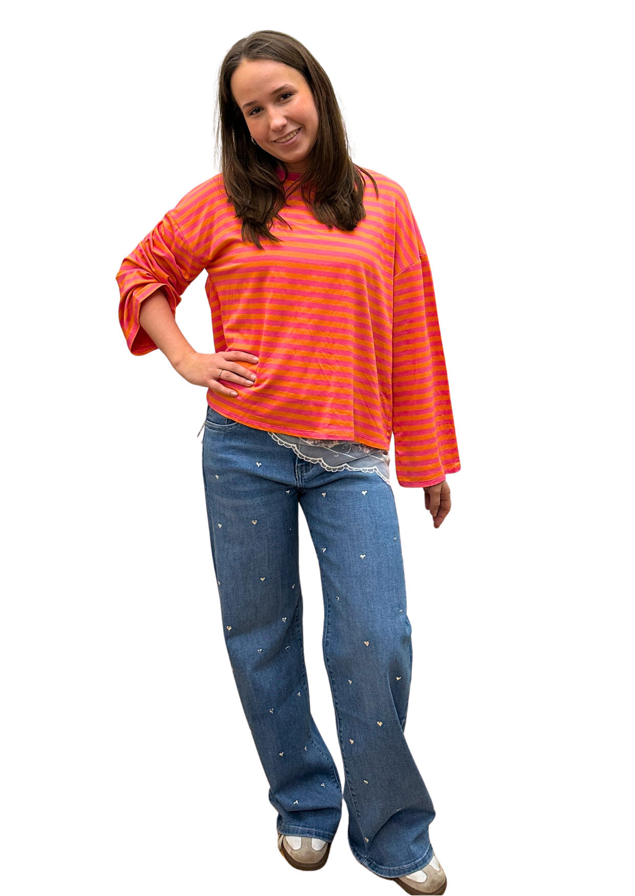 Hoe leuk is deze top met roze en bordeaux strepen of in de andere kleurtjes. En het is superzacht, stretch stof.